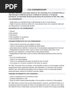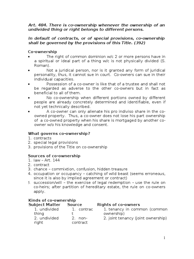 In default of contracts, or of special provisions, co-ownership shall be governed by the provisions of this Title. (392) Co-ownership The right of common dominion w/c 2 or more persons have in a spiritual or ideal part of a thing w/c is not physically divided (S. Roman). Not a juridical person, nor is it granted any form of juridical personality, thus, it cannot sue in court. Co-owners can sue in their individual capacities. Possession of a co-owner is like that of a trustee and shall not be regarded as adverse to the other co-owners but in fact as beneficial to all of them. No co-ownership when different portions owned by different people are already concretely determined and identifiable, even if not yet technically described. A co-owner can only alienate his pro indiviso share in the coowned property. Thus, a co-owner does not lose his part ownership of a co-owned property when his share is mortgaged by another coowner w/o his knowledge and consent. What governs co-ownership? 1. contracts 2. special legal provisions 3. provisions of the Title on co-ownership Sources of co-ownership 1. law Art. 144 2. contract 3. chance commixtion, confusion, hidden treasure 4. occupation or occupancy catching of wild beast (seems erroneous, since it is also by implied agreement or contract) 5. succession/will the exercise of legal redemption use the rule on co-heirs; after partition of hereditary estate, the rule on co-owners apply. Kinds of co-ownership Subject Matter Source 1. undivided 1. contrac thing t 2. undivided 2. nonright contract Rights of co-owners 1. tenancy in common (common ownership) 2. joint tenancy (joint ownership)