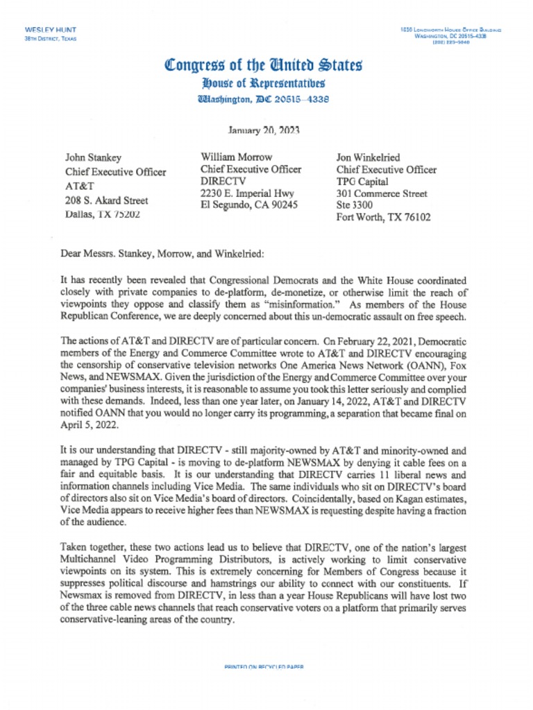 "Newsmax is removed from DIRECTY, in less than a year House Republicans will have lost two