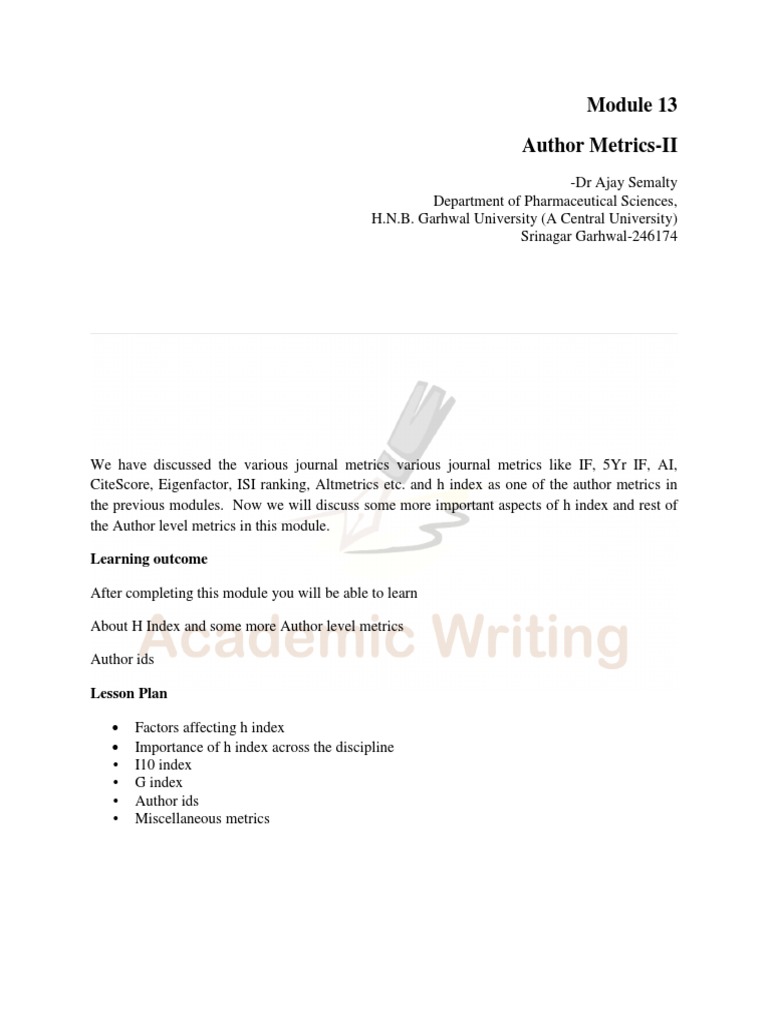 the previous modules. Now we will discuss some more important aspects of h index and rest of