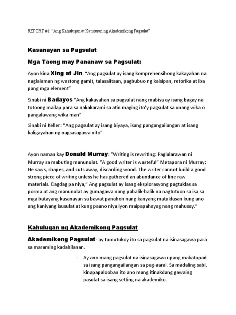 REPORT #1: “Ang Kahulugan at Katuturan ng Akademikong Pagsulat”