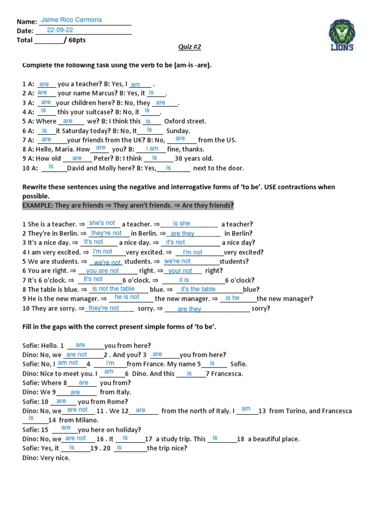 Rewrite these sentences using the negative and interrogative forms of ‘to be’. USE contractions when