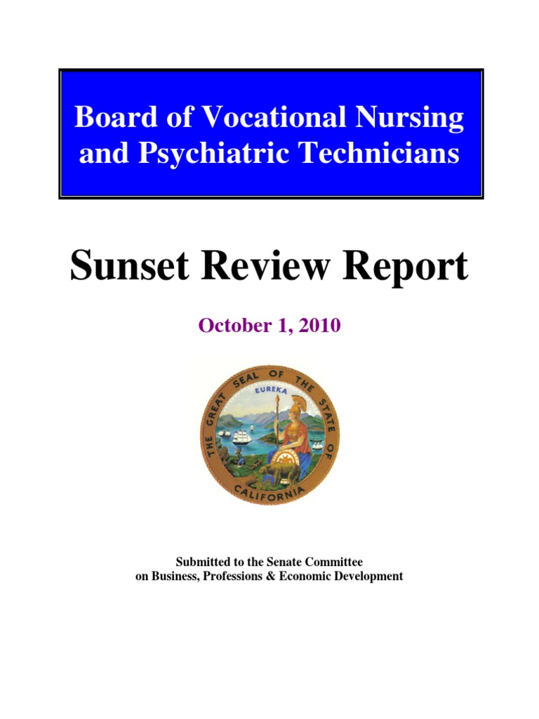 Board of Vocational Nursing and Psychiatric Technicians Sunset Review Report. Submitted to the Senate Committee on business, professions and economic development.