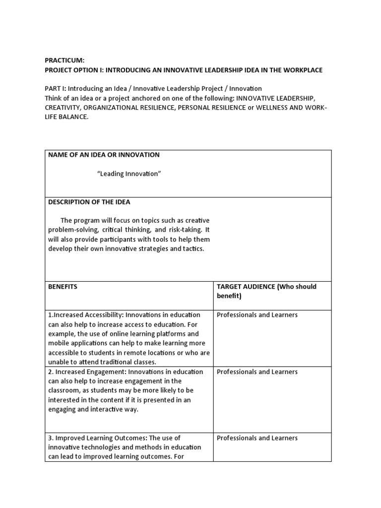 Think of an idea or a project anchored on one of the following: INNOVATIVE LEADERSHIP,
