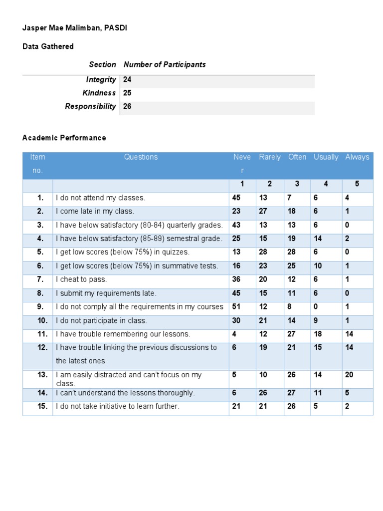 of sleep, and the sleeping patterns. Another fifteen (15) statements under their academic