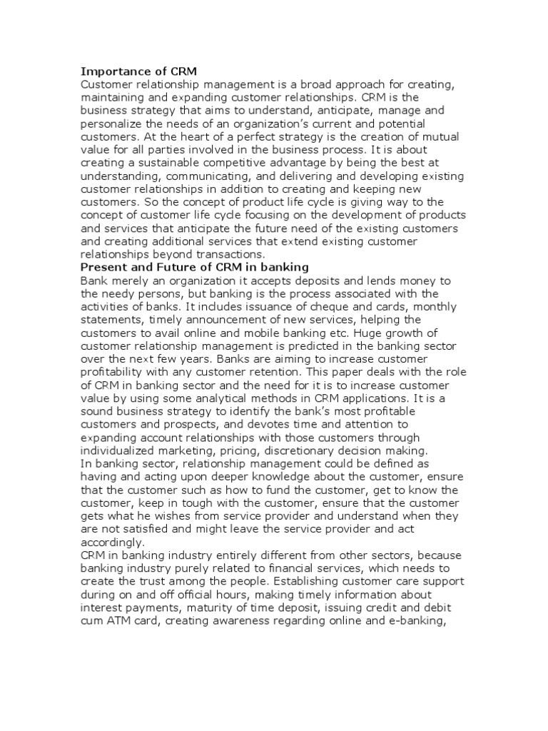 CRM is the business strategy that aims to understand, anticipate, manage and personalize the needs of an organizations current and potential customers. At the heart of a perfect strategy is the creation of mutual value for all parties involved in the business process. It is about creating a sustainable competitive advantage by being the best at understanding, communicating, and delivering and developing existing customer relationships in addition to creating and keeping new customers. So the concept of product life cycle is giving way to the concept of customer life cycle focusing on the development of products and services that anticipate the future need of the existing customers and creating additional services that extend existing customer relationships beyond transactions. Present and Future of CRM in banking Bank merely an organization it accepts deposits and lends money to the needy persons, but banking is the process associated with the activities of banks. It includes issuance of cheque and cards, monthly statements, timely announcement of new services, helping the customers to avail online and mobile banking etc. Huge growth of customer relationship management is predicted in the banking sector over the next few years. Banks are aiming to increase customer profitability with any customer retention. This paper deals with the role of CRM in banking sector and the need for it is to increase customer value by using some analytical methods in CRM applications. It is a sound business strategy to identify the banks most profitable customers and prospects, and devotes time and attention to expanding account relationships with those customers through individualized marketing, pricing, discretionary decision making. In banking sector, relationship management could be defined as having and acting upon deeper knowledge about the customer, ensure that the customer such as how to fund the customer, get to know the customer, keep in tough with the customer, ensure that the customer gets what he wishes from service provider and understand when they are not satisfied and might leave the service provider and act accordingly. CRM in banking industry entirely different from other sectors, because banking industry purely related to financial services, which needs to create the trust among the people. Establishing customer care support during on and off official hours, making timely information about interest payments, maturity of time deposit, issuing credit and debit cum ATM card, creating awareness regarding online and e-banking,