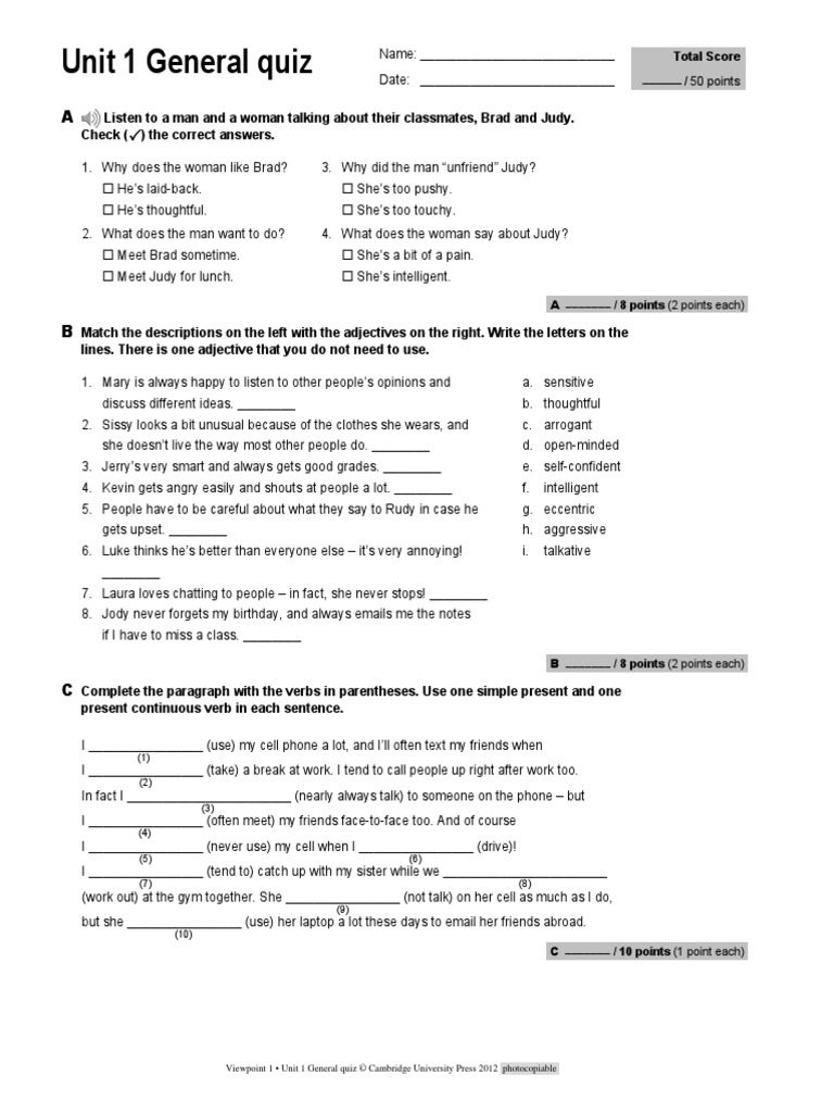 Viewpoint 1 • Unit 1 General quiz © Cambridge University Press 2012 photocopiable