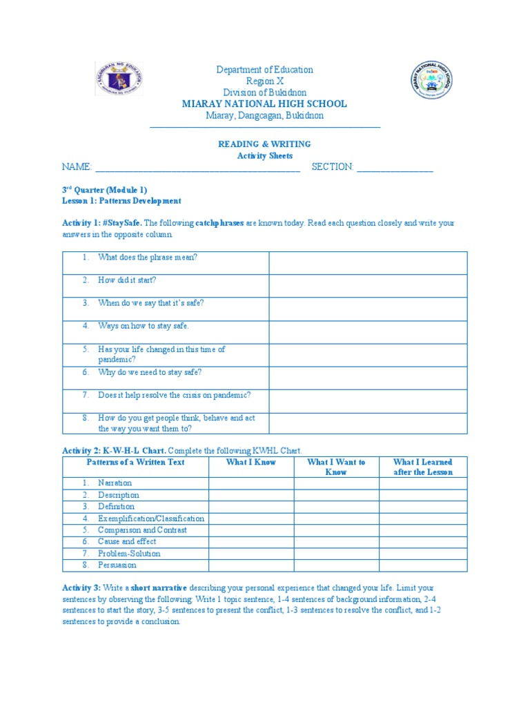 Patterns of a Written Text What I Know What I Want to What I Learned