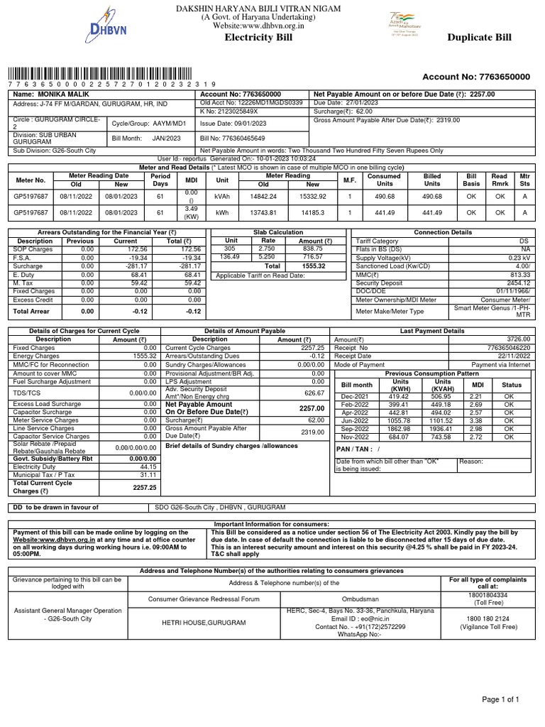 Address: J-74 FF M/GARDAN, GURUGRAM, HR, IND Old Acct No: 12226MD1MGDS0339 Due Date: 27/01/2023