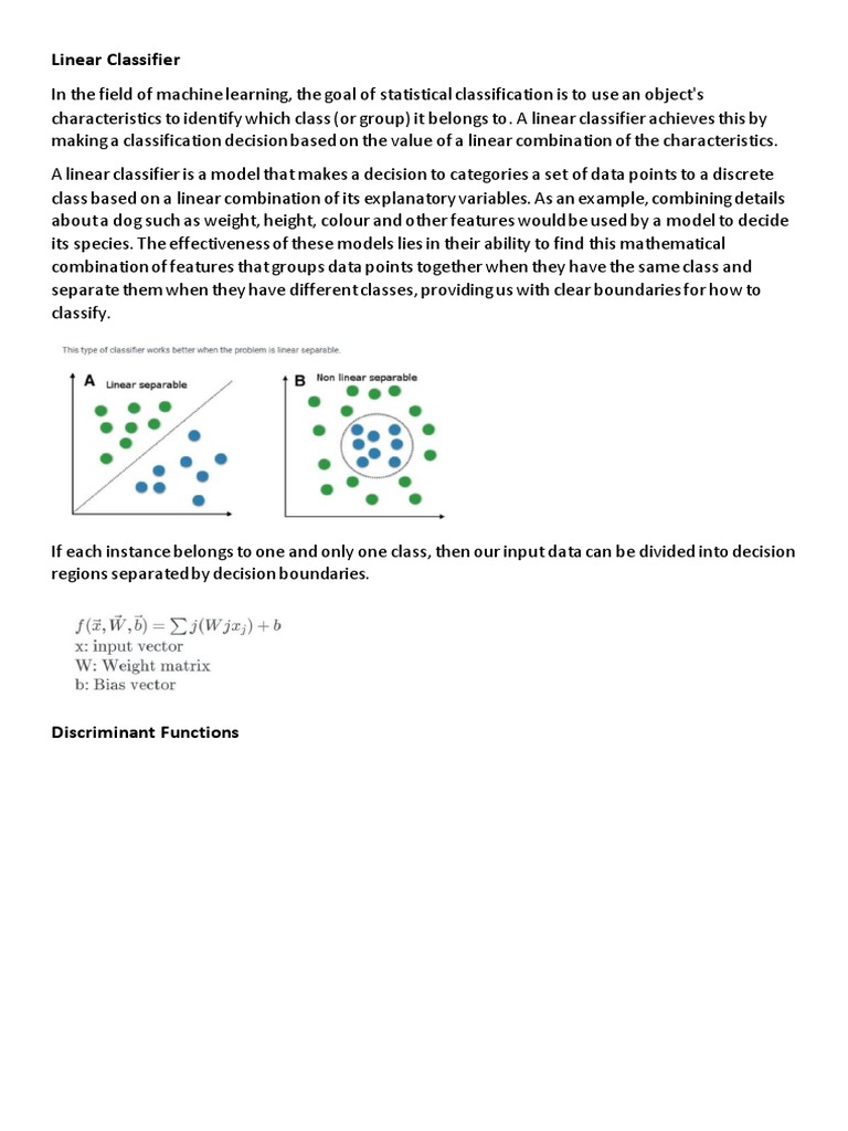 characteristics to identify which class (or group) it belongs to. A linear classifier achieves this by