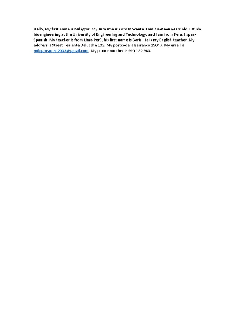 Hello, My first name is Milagros. My surname is Pozo Inocente. I am nineteen years old.