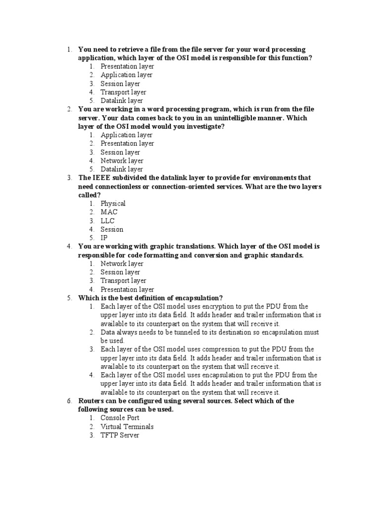 You need to retrieve a file from the file server for your word processing application, which layer of the OSI model is responsible for this function? 1. Presentation layer 2. Application layer 3. Session layer 4. Transport layer 5. Datalink layer 2. You are working in a word processing program, which is run from the file server. Your data comes back to you in an unintelligible manner. Which layer of the OSI model would you investigate? 1. Application layer 2. Presentation layer 3. Session layer 4. Network layer 5. Datalink layer 3. The IEEE subdivided the datalink layer to provide for environments that need connectionless or connection-oriented services. What are the two layers called? 1. Physical 2. MAC 3. LLC 4. Session 5. IP 4. You are working with graphic translations. Which layer of the OSI model is responsible for code formatting and conversion and graphic standards. 1. Network layer 2. Session layer 3. Transport layer 4. Presentation layer 5. Which is the best definition of encapsulation? 1. Each layer of the OSI model uses encryption to put the PDU from the upper layer into its data field. It adds header and trailer information that is available to its counterpart on the system that will receive it. 2. Data always needs to be tunneled to its destination so encapsulation must be used. 3. Each layer of the OSI model uses compression to put the PDU from the upper layer into its data field. It adds header and trailer information that is available to its counterpart on the system that will receive it. 4. Each layer of the OSI model uses encapsulation to put the PDU from the upper layer into its data field. It adds header and trailer information that is available to its counterpart on the system that will receive it. 6. Routers can be configured using several sources. Select which of the following sources can be used. 1. Console Port 2. Virtual Terminals 3. TFTP Server