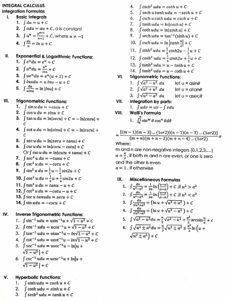INTEGRAL CALCULUS Integration Formulas VV. Basic Integrals 1. fdu=utc 2. fadu = au + C, ais constant 3. fu"="246,wheren#—1 4, f#=mnure Exponential & Logarithmic Functions: 1. feYdu=e"+0 2 fatu=H+¢ 3. fuetdu=e%(u+1)+¢ 4. finmudu = ulnu-u+e 5. Trigonometric Functions: 1. fsinudu =—cosu+C 2 feosudu =sinu+¢ 3. ftanudu = In|secu| + =—In|cosu| + c 4. fcotudu = In|sinu| + c —Infescu| + 5. fsecudu = In|secu + tanu| +C 6 fescudu =Inlescu — cotul +C Or fescu du = Inlescu + tanu| + 7. Ssec? udu =—tanu+c 8. fese? udu =—-cotut+C 9% Ssin?udu=2u—-Zsindu+C 10. fcos?udu =Fu + 2sin2u +C 11. ftan? udu = tanu-u+C 12. f cot? udu = —cotu—u+C 13. fsecu tanudu = secu + C 14, fsinudu = ~escu+C Inverse Trigonometric Functions: JSsin-* udu = usin“tu + VI? + 6 Scos™*udu = ucosu + VI-w +6 Stan-t udu = utan“u ~ InvI=w? +€ Scot! udu = ucot“tu — Invi —u? + J sec“! udu = usec“tu — Infu + VI-w | +c 6. fesc™tudu = uese“*u + Infu + VI-# |+c 2ReENm Hyperbolic Functions: 1. fsinhudu coshu+C vi. vil. vill, 4. fesch* udu = cothu+C 5. fsechutanh udu = —sechu+C 6. feschucoth udu = cschut+C 7. In|eosh ul + C 8. Injsinhul + ¢ 9. tan7'(sinhu) + C 10. feschudu = In|tanh$| +¢ M1. fsinh? udu = #sinh2u—2u+6 12. Scosh? udu =