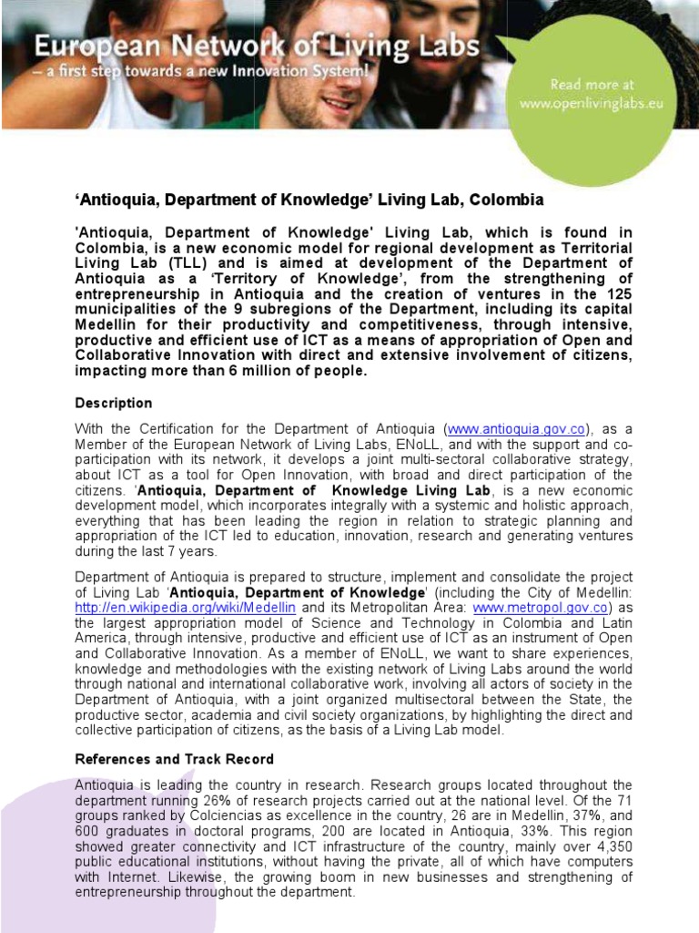 Description With the Certification for the Department of Antioquia ([Link]), as a ([Link] Member of the European Network of Living Labs, ENoLL, and with the support and coparticipation with its network, it develops a joint multi sectoral collaborative strategy, multi-sectoral about ICT as a tool for Open Innovation, with broad and direct participation of the citizens. Antioquia, Department of Knowledge Living Lab, is a ne economic Antioquia, Lab, new development model, which incorporates integrally with a systemic and holistic approach, everything that has been leading the region in relation to strategic planning and appropriation of the ICT led to education, innovation, research and generat generating ventures during the last 7 years. Department of Antioquia is prepared to structure, implement and consolidate the project of Living Lab Antioquia, Department of Knowledge (including the City of Medellin: Antioquia, Knowledge [Link] and its Metropolitan Area: [Link] as [Link]) the largest appropriation model of Science and Technology in Colombia and Latin America, through intensive, productive and efficient use of ICT as an instrument of Open and and Collaborative Innovation. As a member of ENoLL, we want to share experiences, knowledge and methodologies with the existing network of Living Labs around the world through national and international collaborative work, involving all actors of society in the collaborative Department of Antioquia, with a joint organized multisectoral between the State, the productive sector, academia and civil society organizations, by highlighting the direct and collective participation of citizens, as the basis of a Living Lab model. References and Track Record Antioquia is leading the country in research. Research groups located throughout the department running 26% of research projects carried out at the national level. Of the 71 groups ranked by Colciencias as excellence in the country, 26 are in Medellin, 37% and 37%, 600 graduates in doctoral programs, 200 are located in Antioquia, 33%. This region showed greater connectivity and ICT infrastructure of the country, mainly over 4,350 public educational institutions, without having the private, all of which have com computers with Internet. Likewise, the growing boom in new businesses and strengthening of entrepreneurship throughout the department.