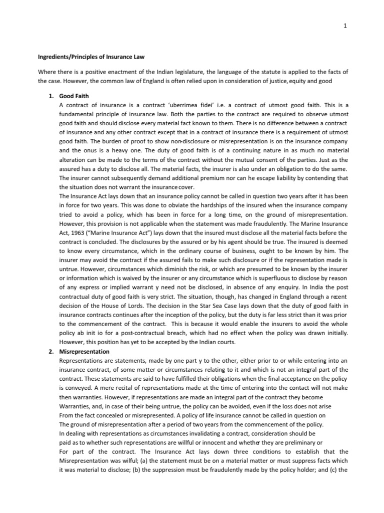 Ingredients/Principles of Insurance Law Where there is a positive enactment of the Indian legislature, the language of the statute is applied to the facts of the case. However, the common law of England is often relied upon in consideration of justice, equity and good 1. Good Faith A contract of insurance is a contract uberrimea fidei i.e. a contract of utmost good faith. This is a fundamental principle of insurance law. Both the parties to the contract are required to observe utmost good faith and should disclose every material fact known to them. There is no difference between a contract of insurance and any other contract except that in a contract of insurance there is a requirement of utmost good faith. The burden of proof to show non-disclosure or misrepresentation is on the insurance company and the onus is a heavy one. The duty of good faith is of a continuing nature in as much no material alteration can be made to the terms of the contract without the mutual consent of the parties. Just as the assured has a duty to disclose all. The material facts, the insurer is also under an obligation to do the same. The insurer cannot subsequently demand additional premium nor can he escape liability by contending that the situation does not warrant the insurance cover. The Insurance Act lays down that an insurance policy cannot be called in question two years after it has been in force for two years. This was done to obviate the hardships of the insured when the insurance company tried to avoid a policy, which has been in force for a long time, on the ground of misrepresentation. However, this provision is not applicable when the statement was made fraudulently. The Marine Insurance Act, 1963 ( Marine Insurance Act ) lays down that the insured must disclose all the material facts before the contract is concluded. The disclosures by the assured or by his agent should be true. The insured is deemed to know every circumstance, which in the ordinary course of business, ought to be known by him. The insurer may avoid the contract if the assured fails to make such disclosure or if the representation made is untrue. However, circumstances which diminish the risk, or which are presumed to be known by the insurer or information which is waived by the insurer or any circumstance which is superfluous to disclose by reason of any express or implied warrant y need not be disclosed, in absence of any enquiry. In India the post contractual duty of good faith is very strict. The situation, though, has changed in England through a re cent decision of the House of Lords. The decision in the Star Sea Case lays down that the duty of good faith in insurance contracts continues after the inception of the policy, but the duty is far less strict than it was prior to the commencement of the contract. This is because it would enable the insurers to avoid the whole policy ab init io for a post-contractual breach, which had no effect when the policy was drawn initially. However, this position has yet to be accepted by the Indian courts. 2. Misrepresentation Representations are statements, made by one part y to the other, either prior to or while entering into an insurance contract, of some matter or circumstances relating to it and which is not an integral part of the contract. These statements are said to have fulfilled their obligations when the final acceptance on the policy is conveyed. A mere recital of representations made at the time of entering into the contact will not make then warranties. However, if representations are made an integral part of the contract they become Warranties, and, in case of their being untrue, the policy can be avoided, even if the loss does not arise From the fact concealed or misrepresented. A policy of life insurance cannot be called in question on The ground of misrepresentation after a period of two years from the commencement of the policy. In dealing with representations as circumstances invalidating a contract, consideration should be paid as to whether such representations are willful or innocent and whether they are preliminary or For part of the contract. The Insurance Act lays down three conditions to establish that the Misrepresentation was wilful; (a) the statement must be on a material matter or must suppress facts which it was material to disclose; (b) the suppression must be fraudulently made by the policy holder; and (c) the