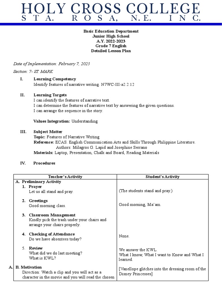 Identify features of narrative writing. N7WC-III-a2.2.12