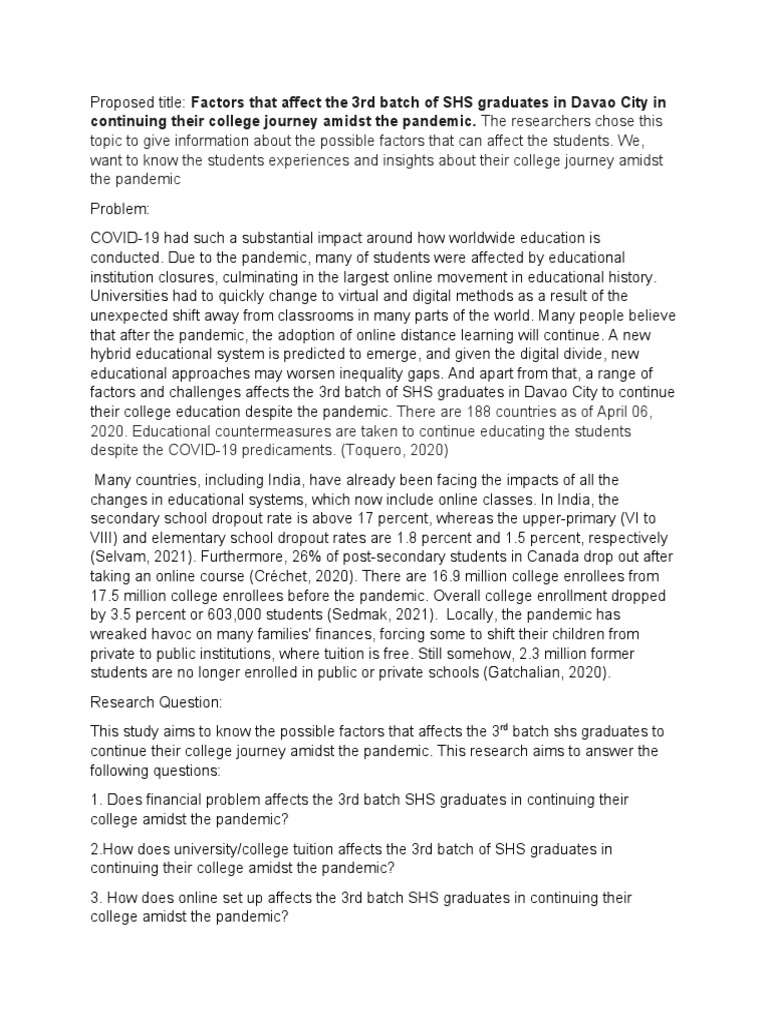Proposed title: Factors that affect the 3rd batch of SHS graduates in Davao City in