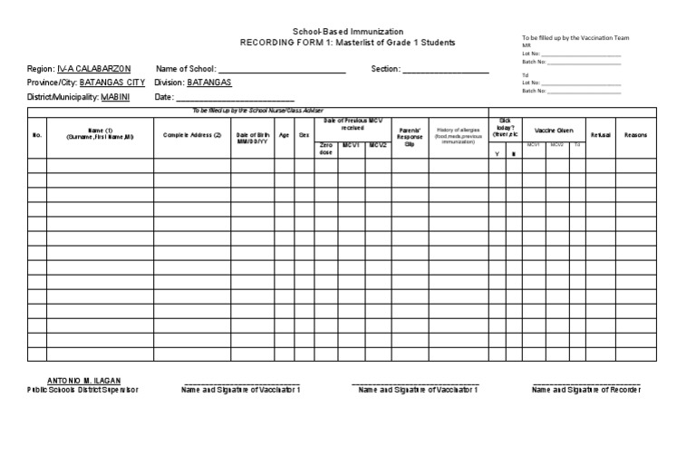RECORDING FORM 1: Masterlist of Grade 1 Students MR