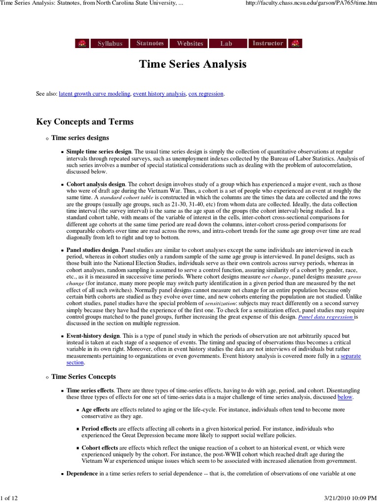 Time Series Analysis: Statnotes, from North Carolina State University, ... http://faculty.chass.ncsu.edu/garson/PA765/time.htm