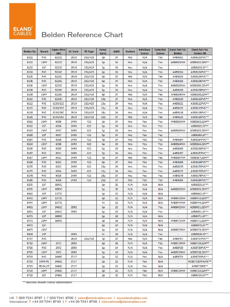 Belden Reference Chart