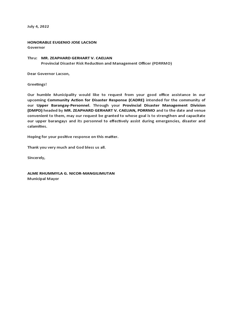 Our humble Municipality would like to request from your good office assistance in our