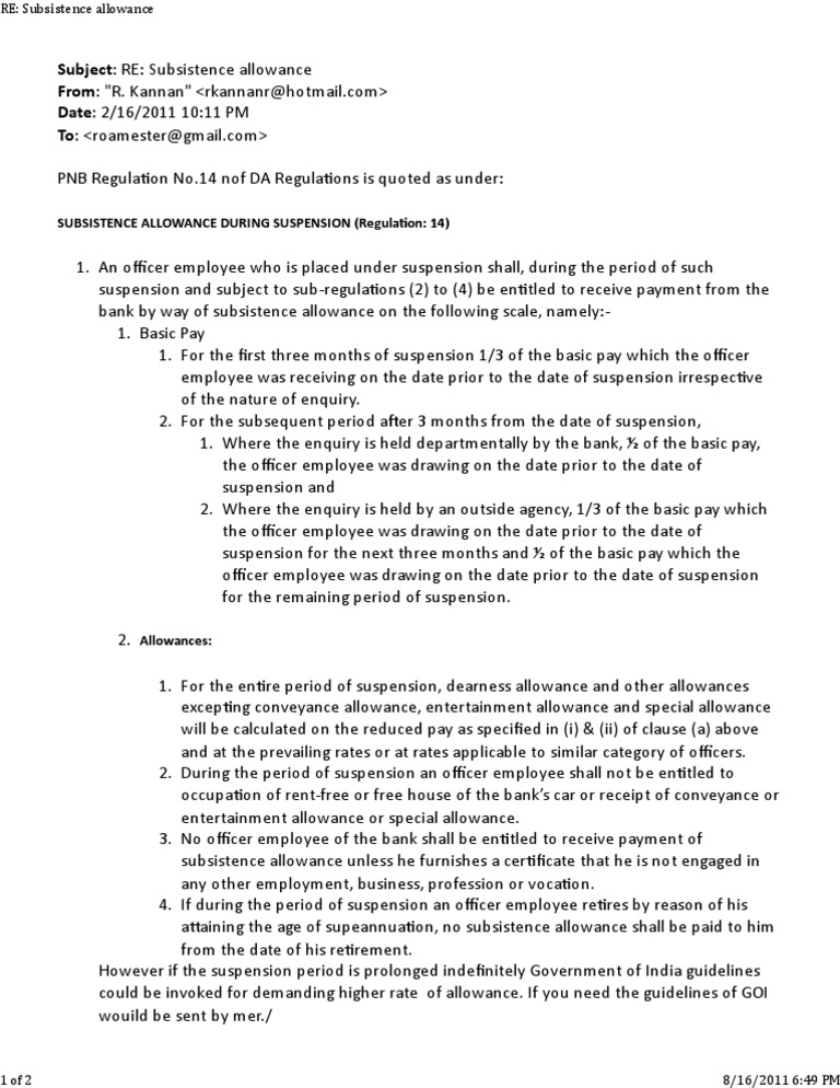 Subject: RE: Subsistence allowance From: "R. Kannan" <rkannanr@hotmail.com> Date: 2/16/2011 10:11 PM To: <roamester@gmail.com> PNB Regula on No.14 nof DA Regula ons is quoted as under: