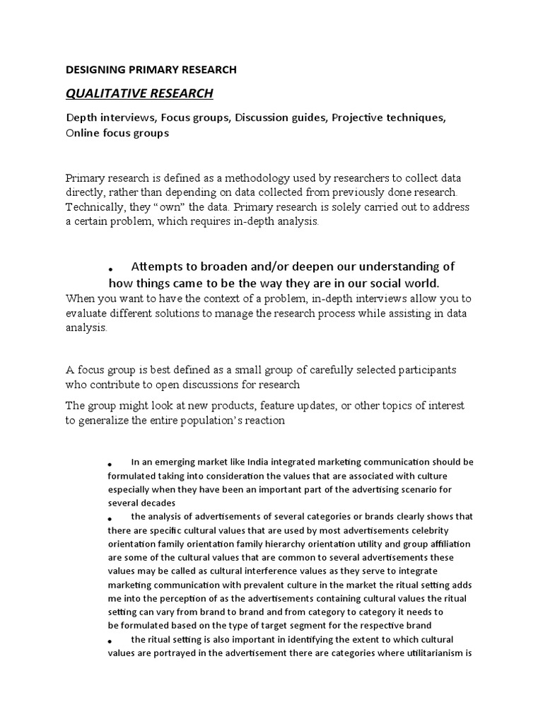 Depth interviews, Focus groups, Discussion guides, Projective techniques,