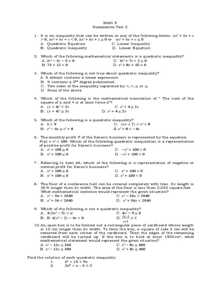 1. It is an inequality that can be written in any of the following forms: 𝑎𝑥2 + 𝑏𝑥 + 𝑐