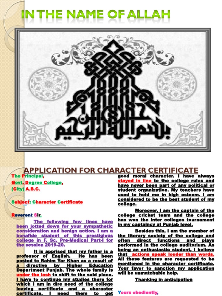 Subject: Character Certificate college.