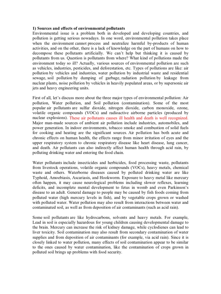 1) Sources and effects of environmental pollutants Environmental issue is a problem both in developed and developing countries, and pollution