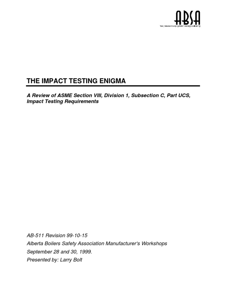 Manufacturers continuously face the challenge of complying with the impact testing provisions of ASME Section VIII, Division 1. Because the Code impact testing rules are quite complex, instances of misconception and or oversight are not unusual, hence the 1enigma. The material provided in this part of the ABSA Manufacturer s Workshop is not intended to replace the Code rules, or the knowledge of Code rules. The intent of this review of impact testing rules and the decision charts provided is to help manufacturers meet Code requirements. This presentation and the handout material was prepared and reviewed with the intent of full compliance with the 1998 Edition, 1999 Addenda of ASME Section VIII, Division 1. With regard to the review process, Mr. Bruce McWhirter (ABSA Design Survey Manager) must be recognized for his efforts as they were sincerely appreciated. The responsibility for any discrepancies between these documents and Code requirements is completely the author s. If discrepancies exist, they should not be misconstrued to reflect an ABSA position. The presentation material consists of a series of impact testing decision charts, and a selection of the most common problems, misconceptions and oversights with regard to impact testing as it applies to pressure vessel construction to the ASME Code, Section VIII, Division 1, CSA B51 Part 1, and Alberta requirements. The primary focus of the document is on Subsection C, Part UCS impact testing requirements.