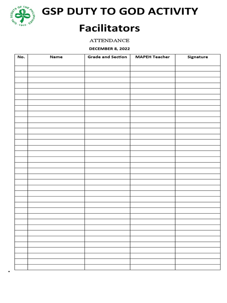 This document is an attendance sheet for a GSP Duty to God activity held on December 8, 2022. It lists the facilitators for the activity and has columns to record the name, grade/section, MAPEH teacher, and signature of participants.