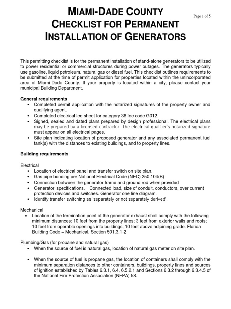 This permitting checklist is for the permanent installation of stand-alone generators to be utilized