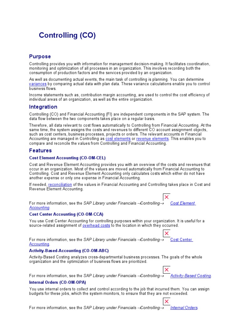 Product Cost Controlling (CO-PC) Product Cost Controlling calculates the costs that occur during manufacture of a product, or provision of a service. It enables you to calculate the minimum price at which a product can be profitably marketed. For more information, see the SAP Library under Financials Controlling Controlling. Profitability Analysis (CO-PA) Profitability Analysis analyzes the profit or loss of an organization by individual market segments. The system allocates the corresponding costs to the revenues for each market segment. Profitability Analysis provides a basis for decision-making, for example, for price determination, customer selection, conditioning, and for choosing the distribution channel. For more information, see the SAP Library under Financials Controlling Profit Center Accounting (EC-PCA) Profit Center Accounting evaluates the profit or loss of individual, independent areas within an organization. These areas are responsible for their costs and revenues. Profit Center Accounting is a statistical accounting component in the SAP system. This means that it takes place on a statistical basis at the same time as true accounting. In addition to costs and revenues, you can display key figures, such as, Return on investment, working capital or cash flow on a profit center. For more information, see the SAP Library under Financials EC-Enterprise Controlling Profit Center Accounting. ECProfitability Analysis. Product Cost