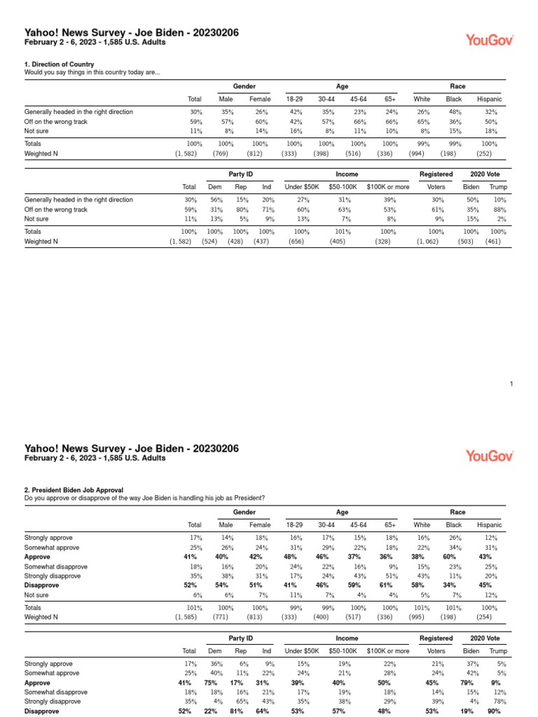 The document reports the results of a Yahoo! News survey of over 1,500 U.S. adults on their views of the direction of the country, approval of President Biden's job performance, and approval…
