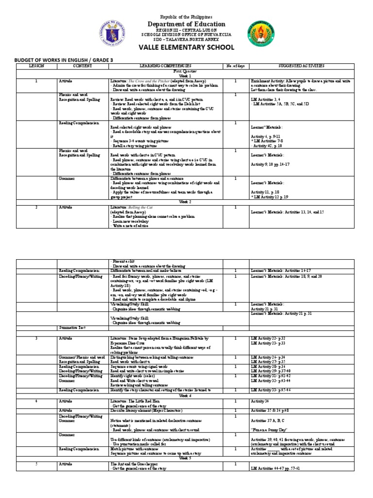 BUDGET OF WORKS IN ENGLISH / GRADE 3