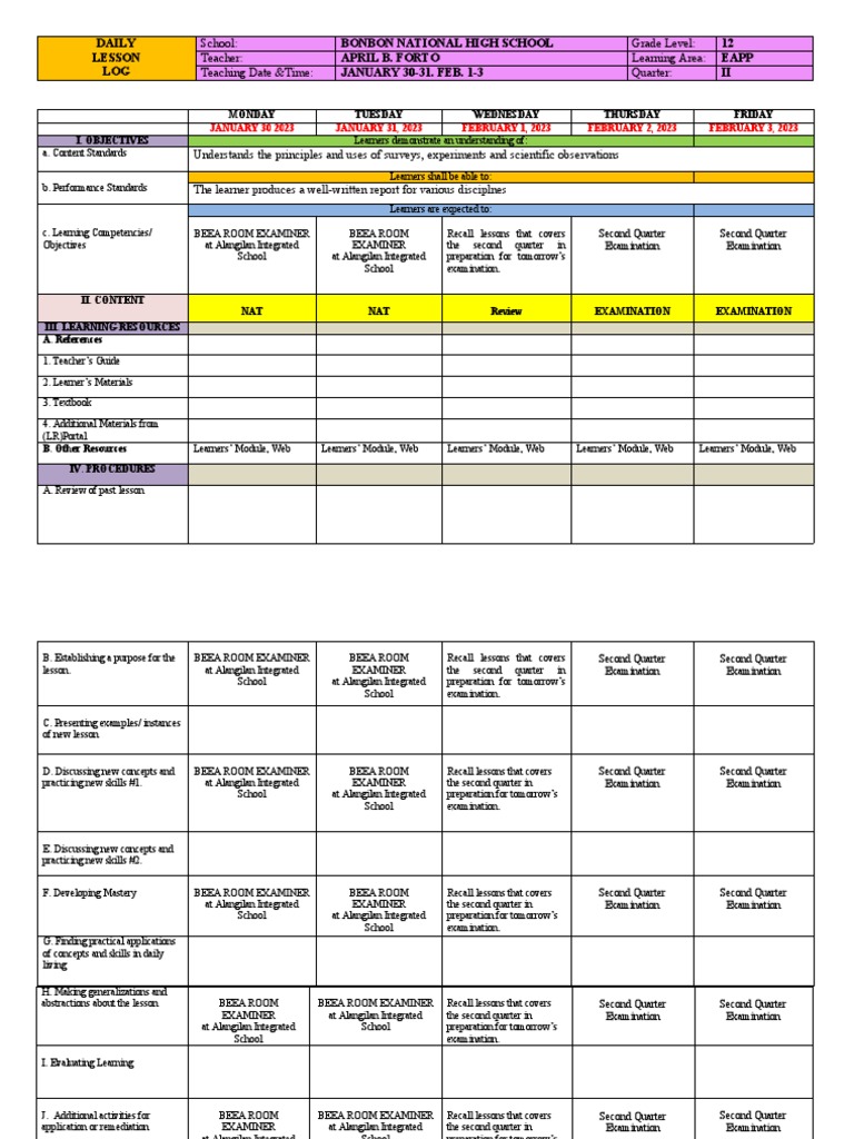 LOG Teaching Date &Time: JANUARY 30-31. FEB. 1-3 Quarter: II