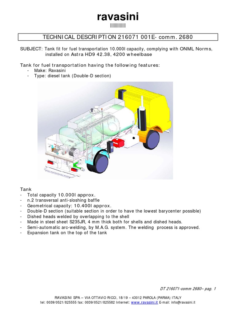 SUBJECT: Tank fit for fuel transportation 10.000l capacity, complying with ONML Norms,