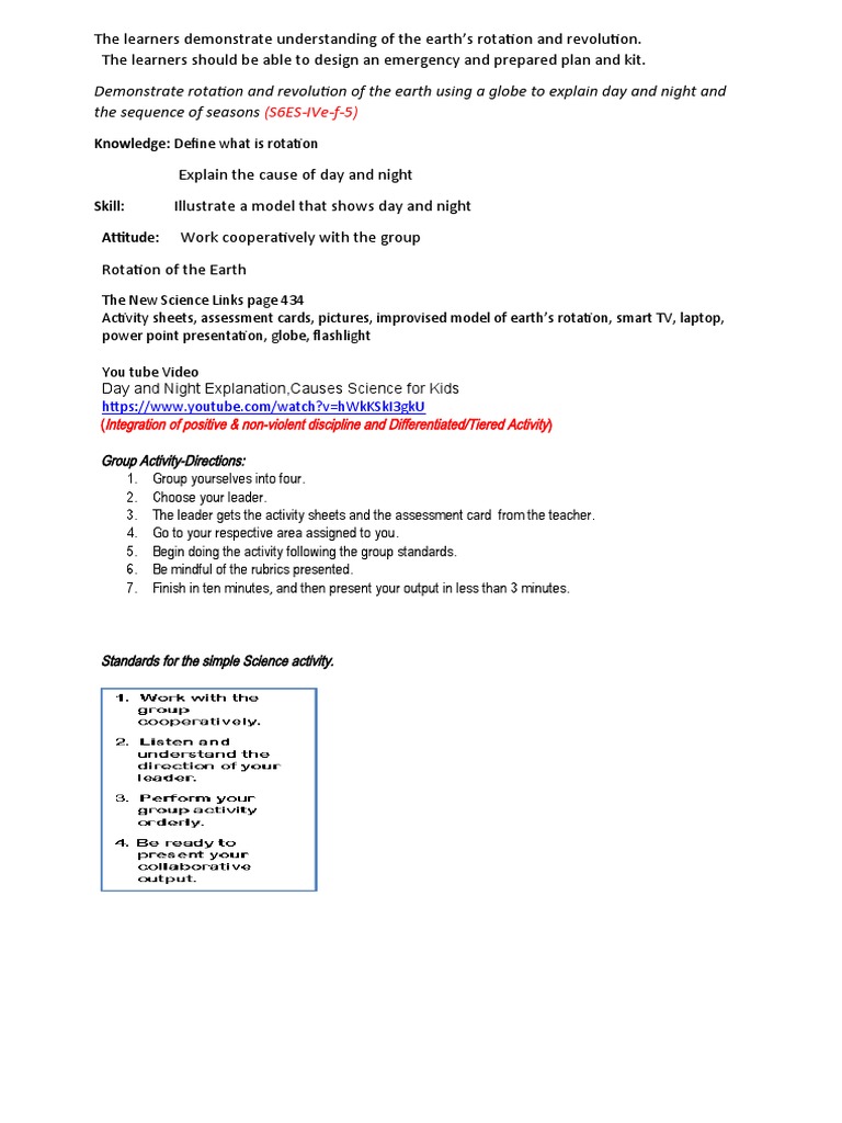 Activity sheets, assessment cards, pictures, improvised model of earth’s rotation, smart TV, laptop,