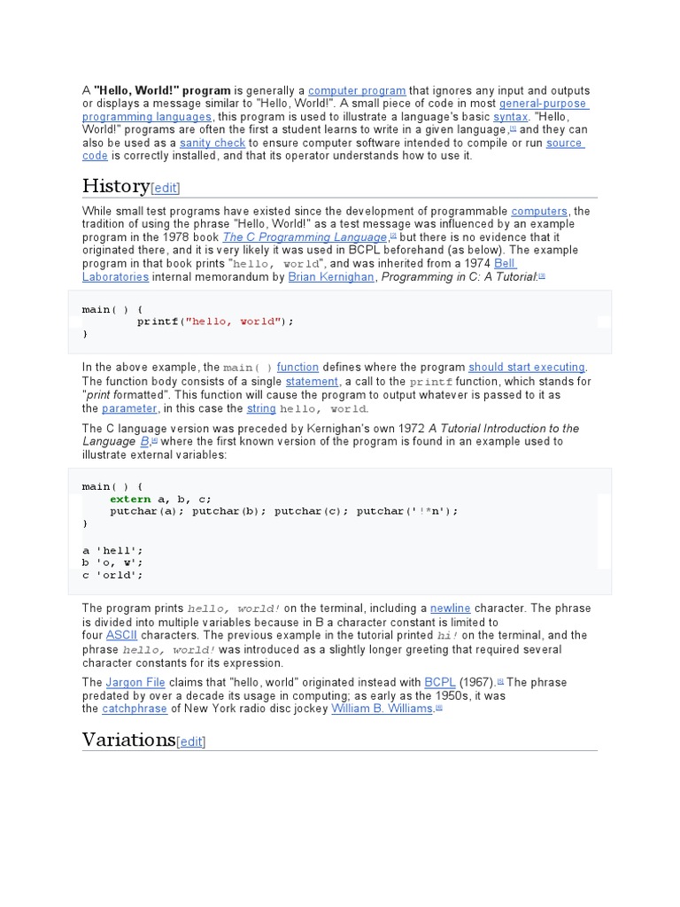 The Jargon File claims that "hello, world" originated instead with BCPL (1967).[5] The phrase