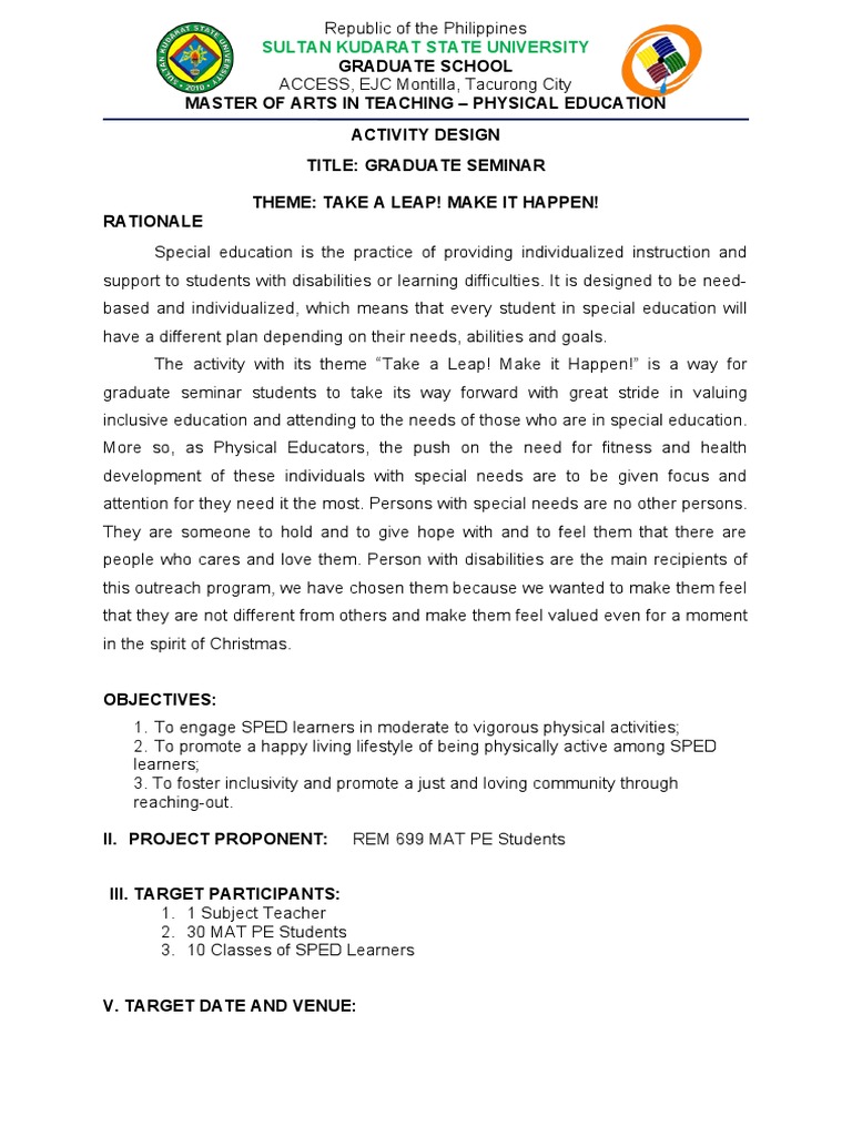 1. To engage SPED learners in moderate to vigorous physical activities;