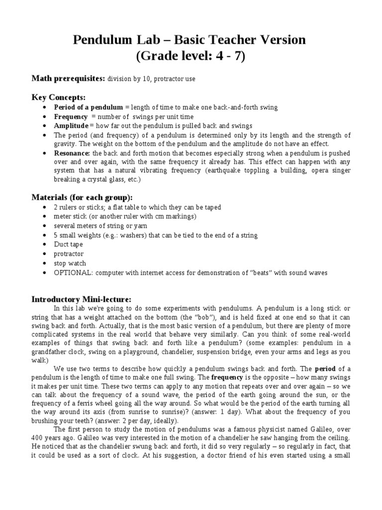 Pendulum Lab Basic Teacher Version (Grade level: 4 - 7)