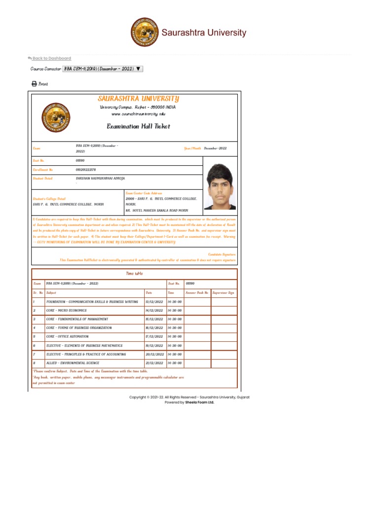 of Saurashtra University examination department as and when required.2) This Hall-Ticket must be maintained till the date of declaration of Result