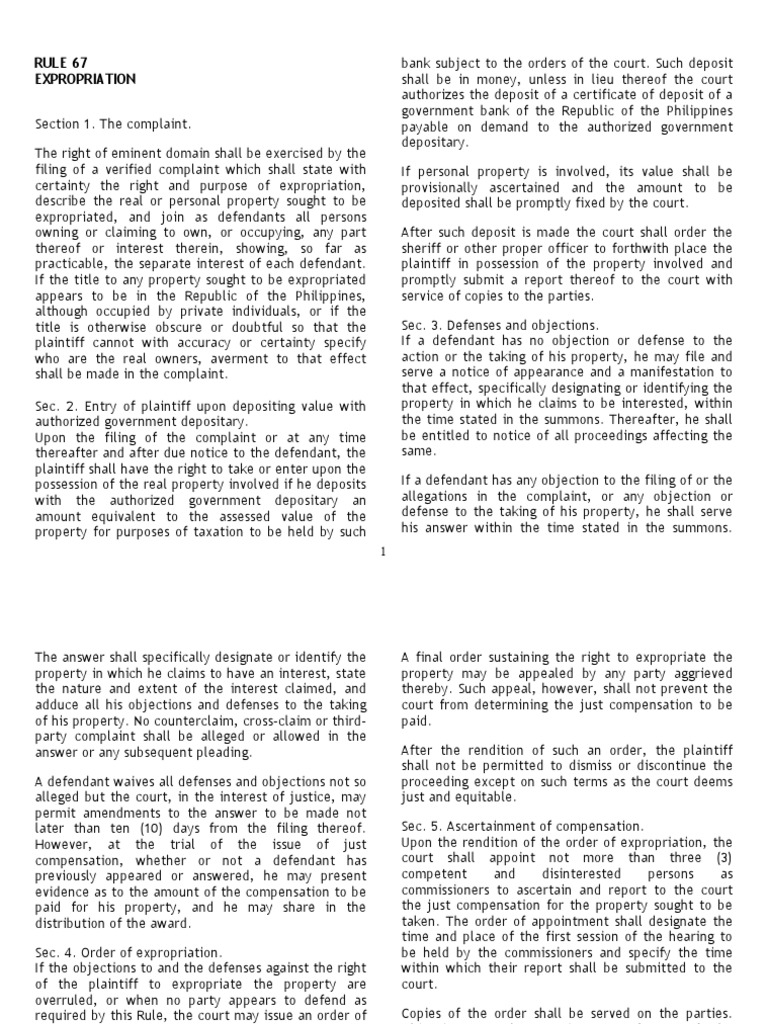 The right of eminent domain shall be exercised by the filing of a verified complaint which shall state with certainty the right and purpose of expropriation, describe the real or personal property sought to be expropriated, and join as defendants all persons owning or claiming to own, or occupying, any part thereof or interest therein, showing, so far as practicable, the separate interest of each defendant. If the title to any property sought to be expropriated appears to be in the Republic of the hilippines, although occupied by private individuals, or if the title is otherwise obscure or doubtful so that the plaintiff cannot with accuracy or certainty specify who are the real owners, averment to that effect shall be made in the complaint. Sec. !. "ntry of plaintiff upon depositing value with authori#ed government depositary. $pon the filing of the complaint or at any time thereafter and after due notice to the defendant, the plaintiff shall have the right to ta%e or enter upon the possession of the real property involved if he deposits with the authori#ed government depositary an amount e&uivalent to the assessed value of the property for purposes of taxation to be held by such