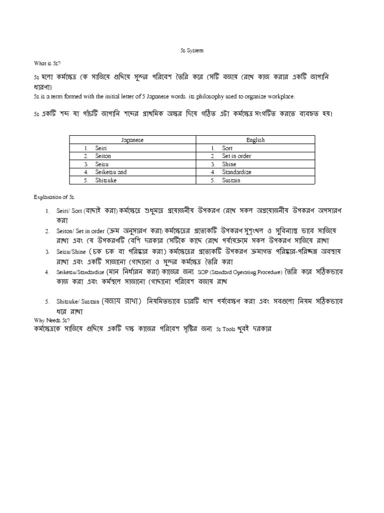 5s হলো কর্মক্ষেত্র কে সাজিয়ে গুছিয়ে সুন্দর পরিবেশ তৈরি করে সেটি বজায় রেখে কাজ করার একটি জাপানি