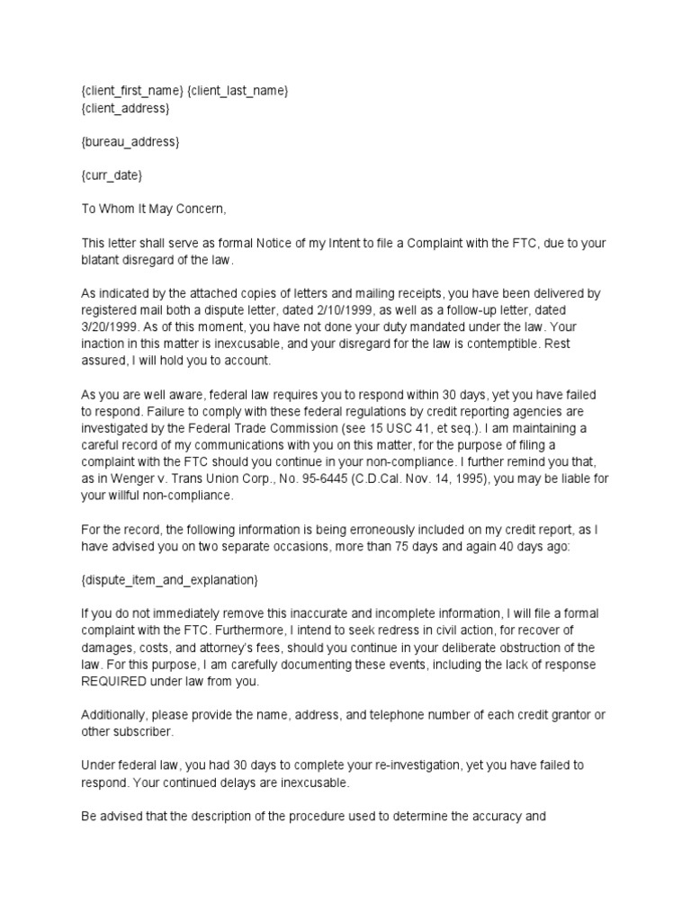 This letter serves as formal notice of intent to file a complaint with the FTC due to the credit bureau's failure to comply with federal law. The letter writer disputes specific information on their credit report that was brought to the bureau's attention over 75 and 40 days ago but has not been removed. If the inaccurate information is not removed immediately, the letter writer will file an FTC complaint and seek damages in civil court for failure to properly investigate the dispute.