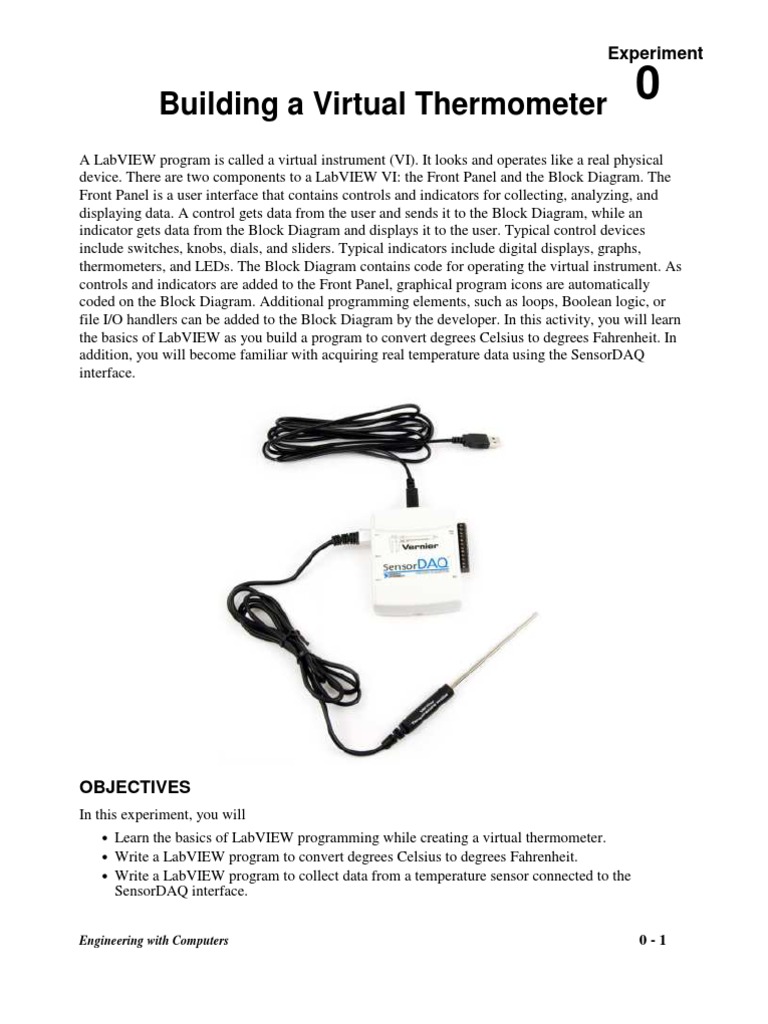 Learn the basics of LabVIEW programming while creating a virtual thermometer. Write a LabVIEW program to convert degrees Celsius to degrees Fahrenheit. Write a LabVIEW program to collect data from a temperature sensor connected to the SensorDAQ interface. 0-1