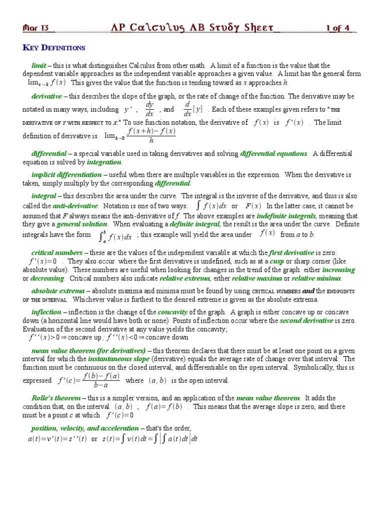critical numbers these are the values of the independent variable at which the first derivative is zero: f ' x =0 . They also occur where the first derivative is undefined, such as at a cusp or sharp corner (like absolute value). These numbers are useful when looking for changes in the trend of the graph: either increasing or decreasing. Critical numbers also indicate relative extrema, either relative maxima or relative minima. absolute extrema absolute maxima and minima must be found by using CRITICAL NUMBERS and the ENDPOINTS OF THE INTERVAL. Whichever value is furthest to the desired extreme is given as the absolute extrema. inflection inflection is the change of the concavity of the graph. A graph is either concave up or concave down (a horizontal line would have both or none) Points of inflection occur where the second derivative is zero. Evaluation of the second derivative at any value yields the concavity; f ' ' x 0 concave up ; f ' ' x 0 concave down mean value theorem (for derivatives) this theorem declares that there must be at least one point on a given interval for which the instantaneous slope (derivative) equals the average rate of change over that interval. The function must be continuous on the closed interval, and differentiable on the open interval. Symbolically, this is f b f a expressed f ' c = where a , b is the open interval. ba Rolle's theorem this is a simpler version, and an application of the mean value theorem. It adds the condition that, on the interval a , b , f a= f b . This means that the average slope is zero, and there must be a point c at which f ' c =0 position, velocity, and acceleration that's the order, a t=v ' t = s' ' t or s t= v t dt = [ a t dt ] dt