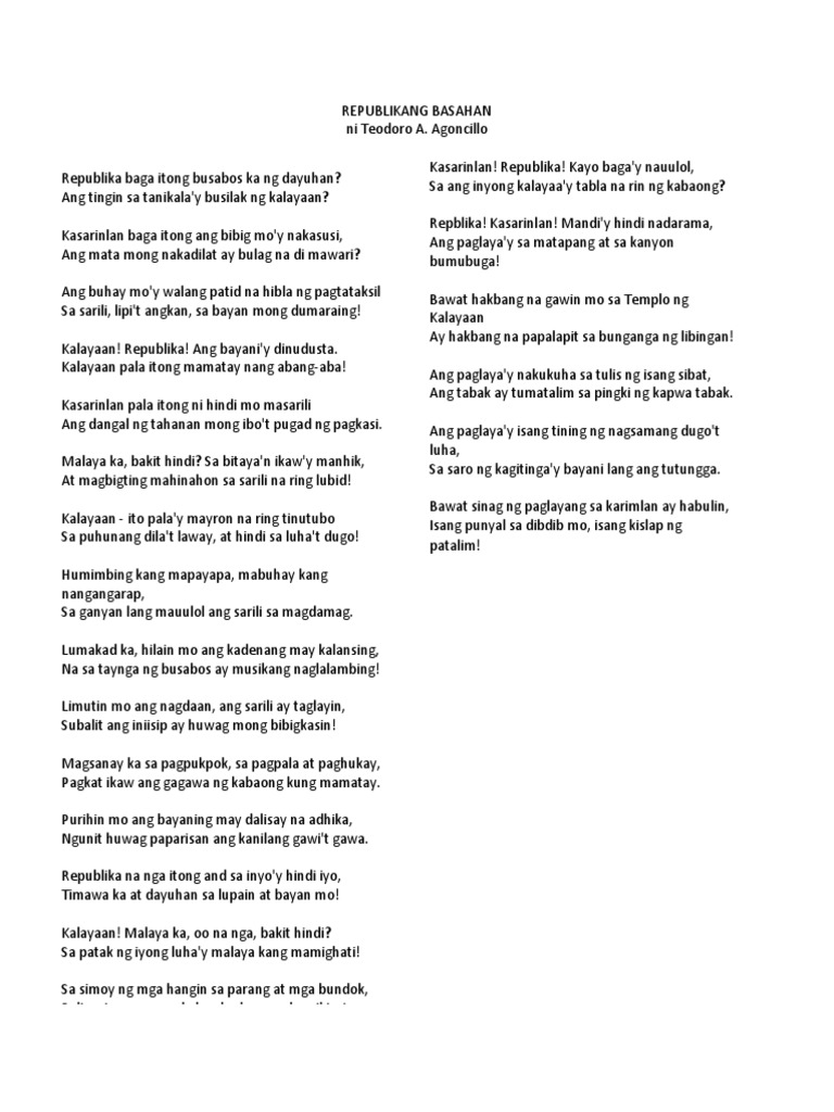 Republika baga itong busabos ka ng dayuhan? Sa ang inyong kalayaa'y tabla na rin ng kabaong?