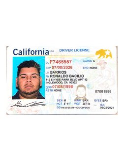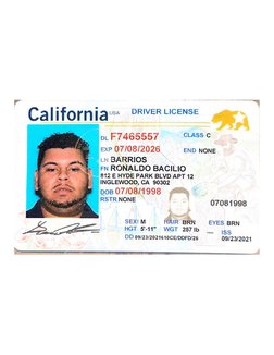 Driver's License Information: Displays details and personal information on the California driver's license such as name, address, license number, and expiration date.