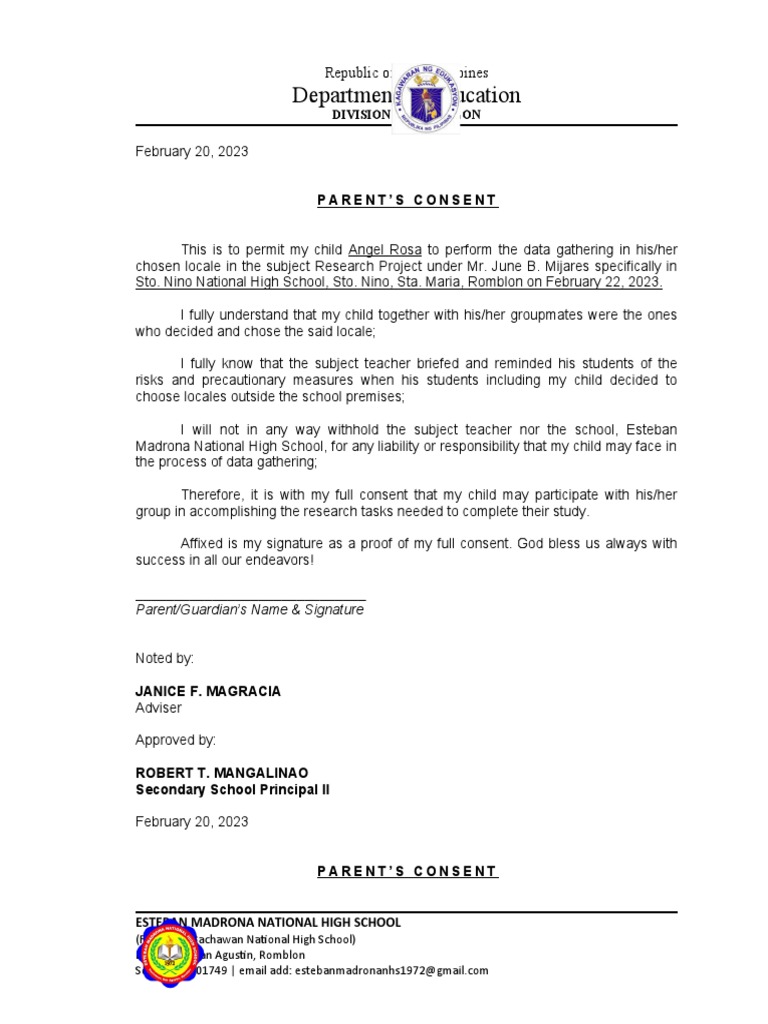 This is to permit my child Ervee Casencia to perform the data gathering in his/her